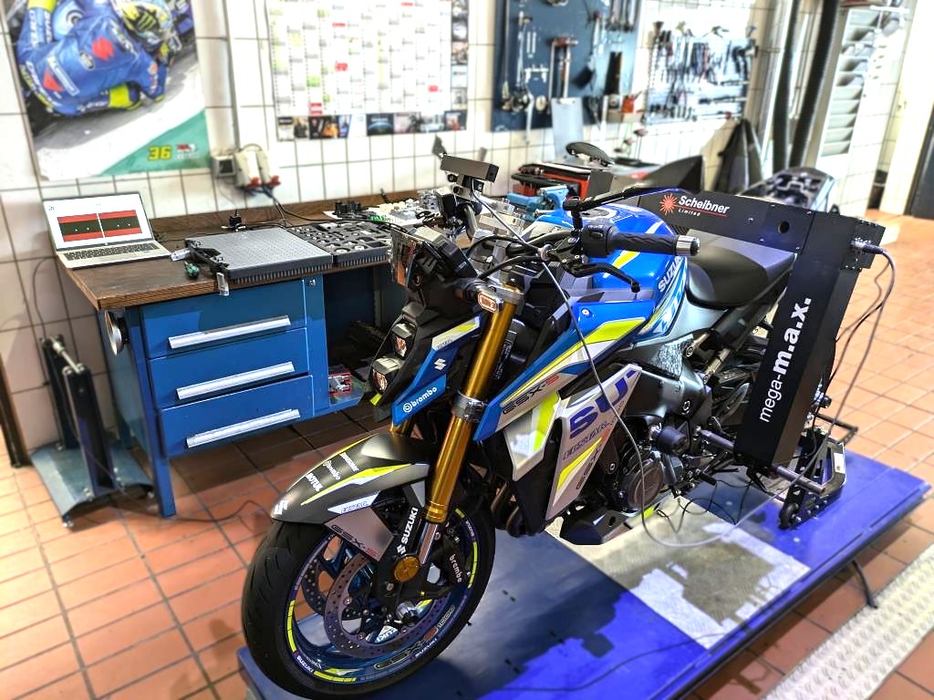 Unter anderem verfügen wir über das aktuelle mega-m.a.x. Messsystem der Firma Scheibner Limited, mit dem Motorradrahmenvermessungen sowohl stationär wie auch mobil, im Regelfall ohne größere Demontagearbeiten am Kraftrad, durchgeführt werden können.
